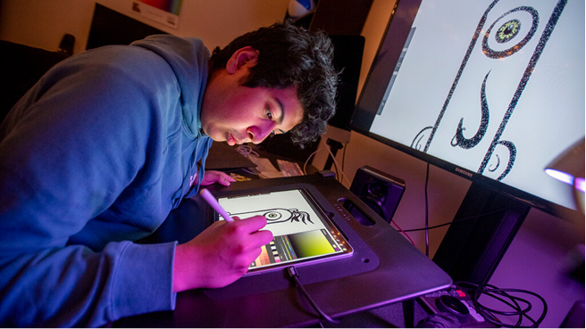 Access state-of-the-art facilities, including a film production studio, sound studio, and high-powered Cintiq computer lab. Students have access to a wide array of professional film and audio equipment.